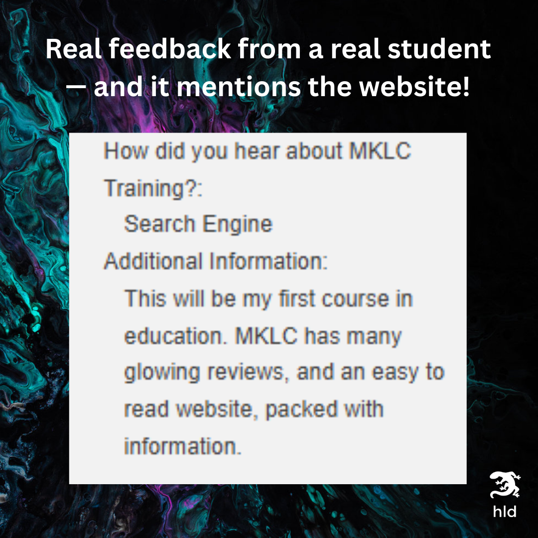 The reviews. MKLC uses CustomerSure — independent review software that's automatically triggered at course completion. No chasing students for feedback, no curating what goes live. Just real, verified responses building up over time, sitting visibly on the site. That independence is what makes them credible. Anyone can paste a glowing quote on a homepage. A live feed of verified reviews you don't control is a different thing entirely.
